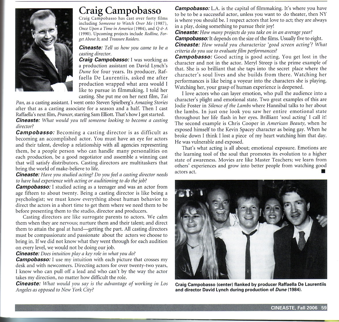 CRAIG IS IN A NEW CASTING ARTICLE THAT HE DID FOR CINEASTE MAGAZINE. THE OTHER TWO CD'S INTERVIEWED ARE ELLEN LEWIS AND AVY KAUFMAN. Its out this FALL. Gretchen Mol is on the cover as Betty Page.